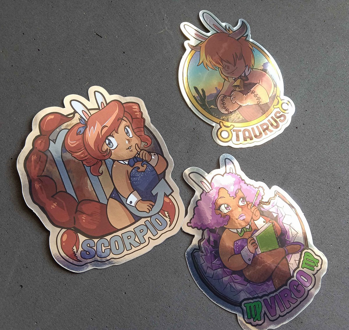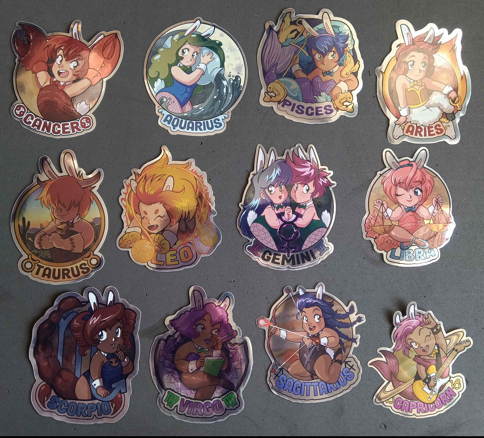 Cute retro anime bunnies, one for each zodiac sign! All designs printed on die-cut mirror gloss stock.